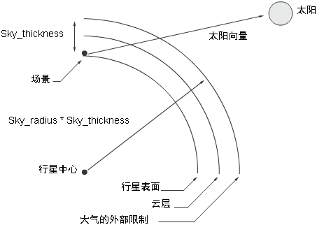 例如,如果“Sky_thickness”为 1000 而“Sky_radius”为 50,则天空的外部半径为 1000 x 50 = 50000 个单位,而行星的半径为 (1000 x 50) - (1000 x 1) = 49000 个单位。