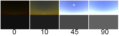 太阳相对于地面的仰角的角度(以度为单位)。有效范围为 -10000 到 10000。滑块范围是 0(日出/日落)到 90(正午)。默认值是 45。