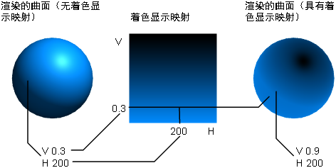 在渲染曲面之后将颜色贴图应用到曲面。将“Shading Map”纹理的 U 值映射到曲面的色调,而将 V 值映射到曲面的强度(由 [R+G+B]/3 定义的值)。着色显示贴图会更改材质球的颜色、镜面颜色和偏心率,从而有效地创建一种新的材质类型。