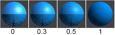控制曲面上反光高光的大小。此参数仅当“Shading Model”为“BLINN”时可用。有效范围为 0(无高光)到 0.999(广泛高光,反光不是很强的曲面)。值为 0.1 会产生较小的高光(有光泽的曲面)。默认值是 0.3。