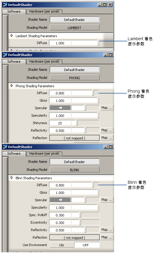 “LAMBERT”、“BLINN”或“PHONG”的“Shading Parameters”各不相同。当“Shading Model”为“LIGHTSOURCE”时不存在任何“Shading Parameters”。
