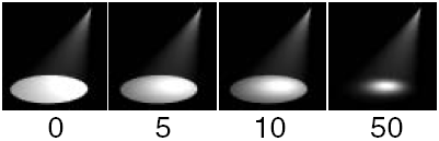 例如,如果“Spread”值为 50 而“Penumbra”值为 10,则聚光灯有 60 (50 + 10) 度的有效扩散;但是,聚光灯强度在 50 度和 60 度的角度之间降低至 0。如果“Spread”值为 50 而“Penumbra”值为 -10,则聚光灯有 50 度的有效扩散且聚光灯强度在 40 度和 50 度的角度之间降低至 0。