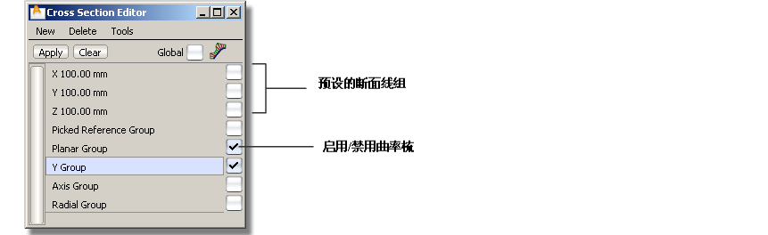 选择这些选项之一可创建横断面组,将横断面组应用到选定的几何体(或者在“Global”处于启用状态时应用到所有几何体),以及打开相应的选项窗口。