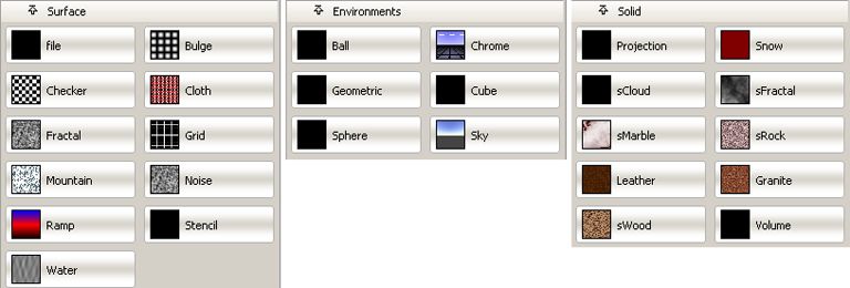 “Texture Procedures”窗口的“Surface”、“Environments”和“Solid”部分会列出您可以映射到环境、材质球、纹理或灯光的参数的所有纹理。