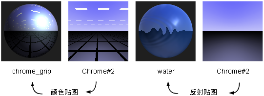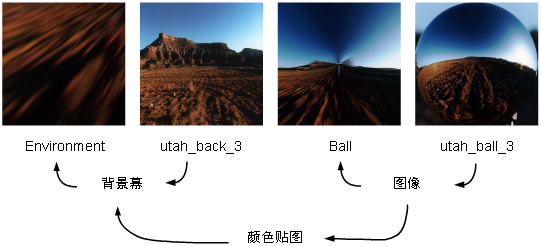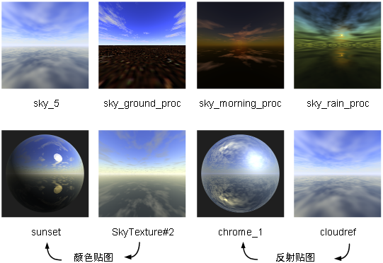环境纹理模拟三维空间。它们可以通过使用一系列图像文件(如“Ball”、“Cube”或“Sphere”纹理),或通过使用计算机图形学程序(如“Chrome”或“Sky”纹理)来进行模拟。通常,会将环境纹理映射到下列各项之一:
