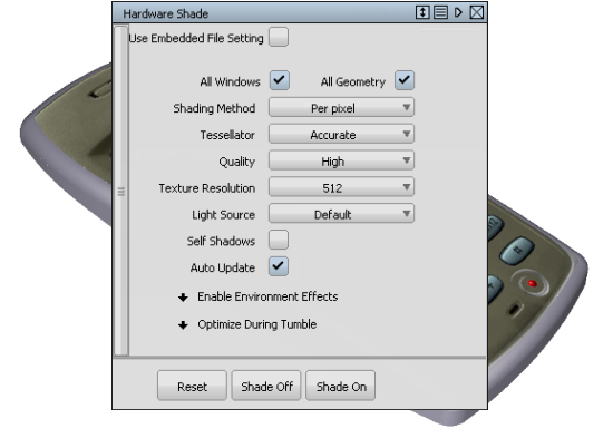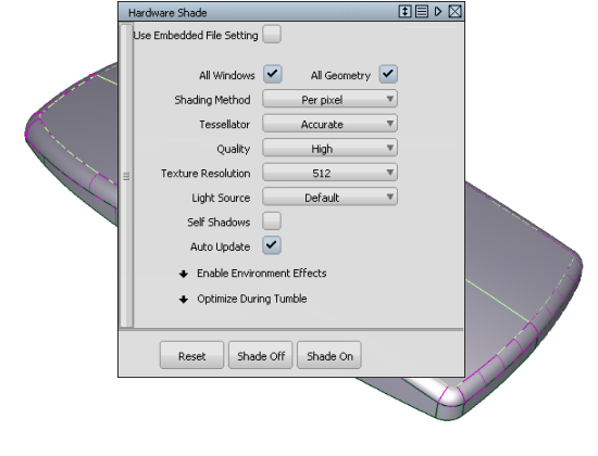 - 在“Hardware Shade”模式下,可以选择查看分层材质球。默认情况下,该选项处于禁用状态,必须启用该选项,才能查看草图投影。默认情况下,禁用分层材质球,因为它们需要通过显卡进行更多图形处理。启用分层材质球时,显卡速度越慢,“Hardware Shade”的性能越低。
