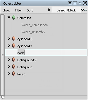 在本部分教程中,通过成组来组织您的模型。一组构成台灯的底座,另一组是呈一定角度的转臂和转轴。使用 Object Lister 对组进行命名和管理。“Object Lister”是场景中对象的图解视图。它用于管理设计的各个组件。