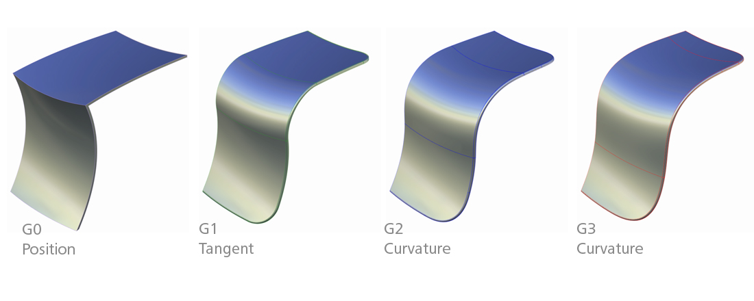 Here is an example of both a curve and a surface being matched at different continuity levels: