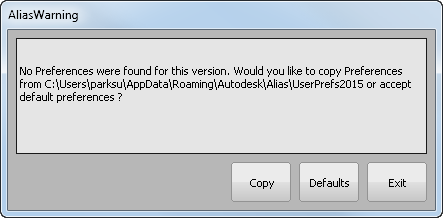 Windows 的用户首选项位于 C:\Users\<username>\AppData\Roaming\Autodesk\Alias\UserPrefs2016。