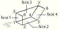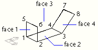 In the following illustration, face 1 is defined by vertices 1, 5, 6, and 2. Face 2 is defined by vertices 1, 4, 3, and 2. Face 3 is defined by vertices 1, 4, 7, and 5, and face 4 is defined by vertices 3, 4, 7, and 8.