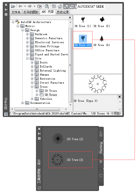 在“AEC 内容”选项卡上,导航到要在其中创建工具的 AEC 内容的文件夹。
