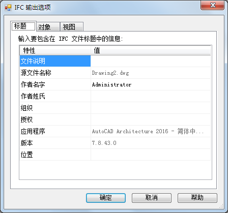 屏幕上处于激活状态的图形的名称将显示在“IFC 输出选项”对话框的“标题”选项卡上。您可以添加有关要输出的图形文件的信息,例如,图形的说明、作者和公司名称、授权数据以及建筑的地理位置。例如,您可以在“标题”选项卡上输入“Structure for Commercial Building 152”作为结构图形的说明。在查看 IFC 文件时,此信息会显示在该 IFC 文件的标题中。