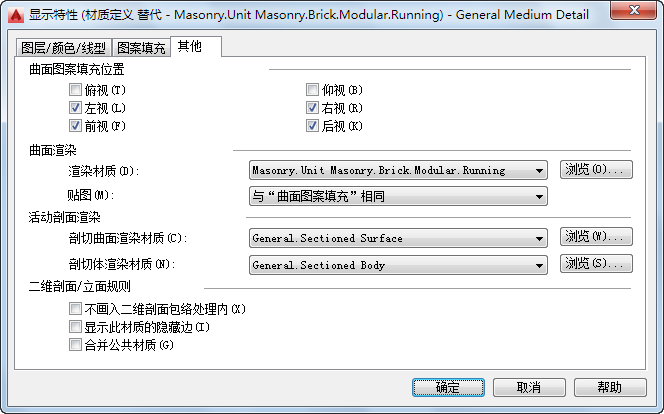 可以访问一个对话框,您可以在其中查看和修改与材质定义关联的显示特性,例如,曲面图案填充位置和曲面渲染,如下所示。