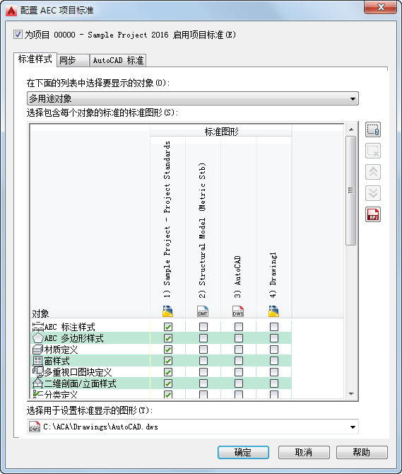 若要设置标准样式和显示设置,则需定义一个或多个包含样式和显示设置标准的项目标准图形。这些图形可以是 DWG、DWT 或 DWS 文件,并已添加到配置对话框中。