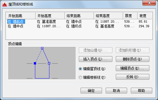 执行以下步骤可以通过在幕墙的屋顶线中添加顶点,将山墙添加到该屋顶线中。