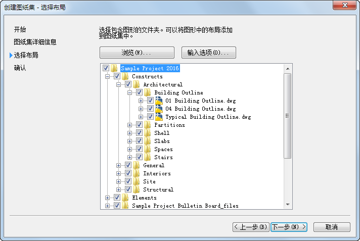 在“创建图纸集 - 选择布局”对话框中,可以从现有图形中选择布置,然后将其作为图纸添加到图纸集样板中。例如,可以通过执行此操作,将旧版图纸转换为项目图纸。