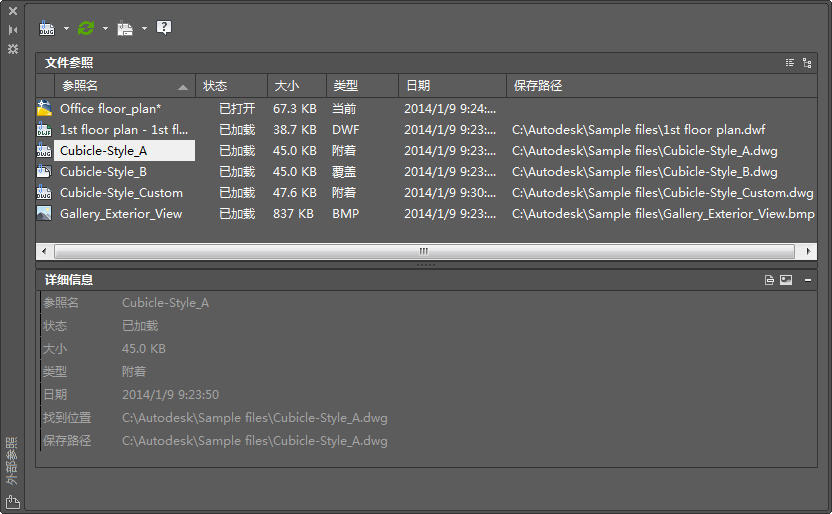 - 在当前图形中显示参照的列表,包括状态、大小和创建日期等信息。
