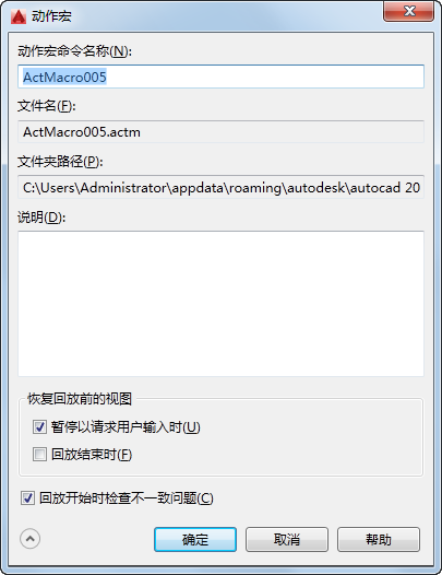 指定当前动作宏的名称。可以输入一个新名称来替换显示的默认名称。