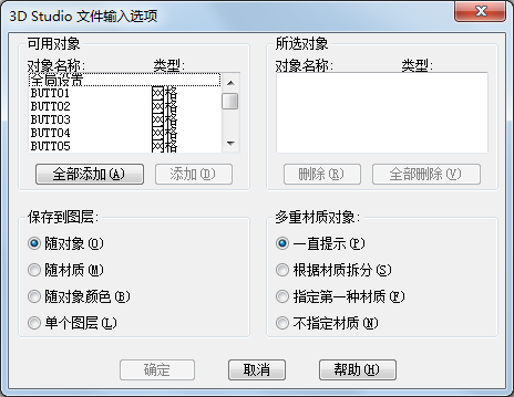 显示指定的 3D Studio (3DS) 文件中所有对象的名称。最多可以选择 70 个对象。
