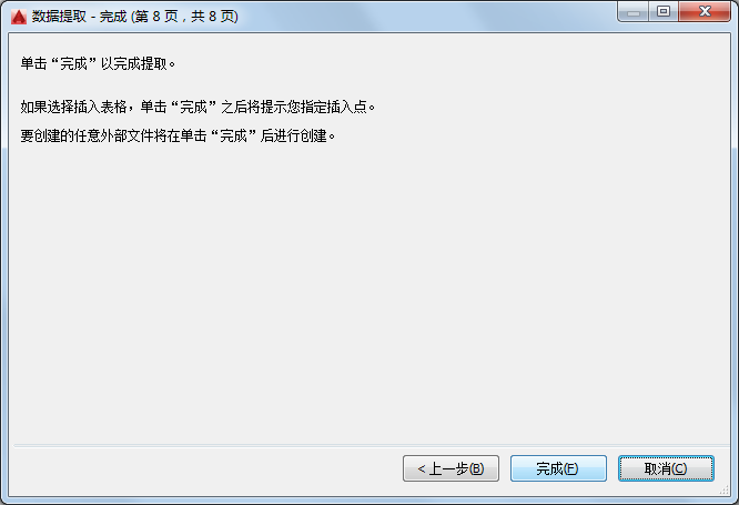 创建填充提取数据的表格。在“完成”页面上单击“完成”后,系统将提示用户将表格插入当前图形中。