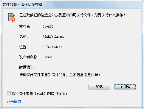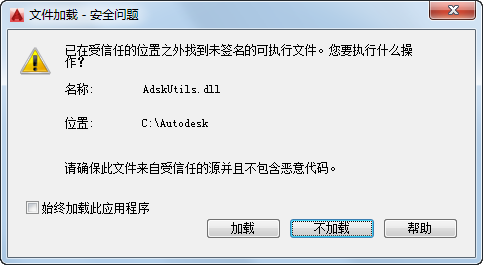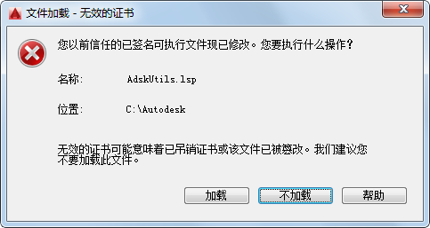 在加载已经过数字签名的自定义程序文件时,基于 AutoCAD 的程序将验证附着到该文件的数字签名。将显示一个消息框,无论是否可以验证数字签名,该消息框都允许用户将程序文件加载到绘图环境中或不进行加载。