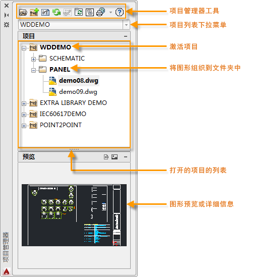 项目管理器是用于处理项目及项目中包含的图形的工具。 查找