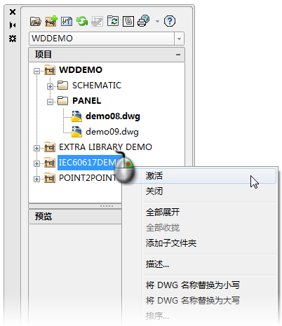 在项目管理器中可以让所需数目的项目处于打开状态,但一次只能有一个项目处于激活状态。适用于项目范围的功能仅处理激活项目中的图形。