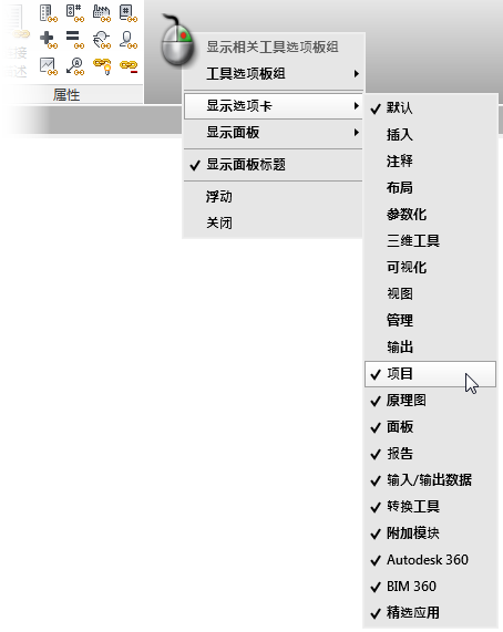 在选项卡区域中单击鼠标右键,然后选择要显示或隐藏的选项卡。