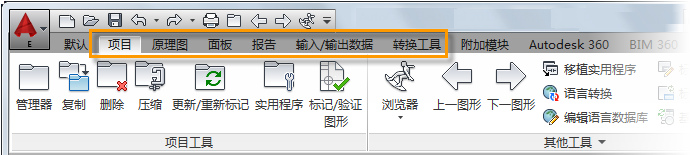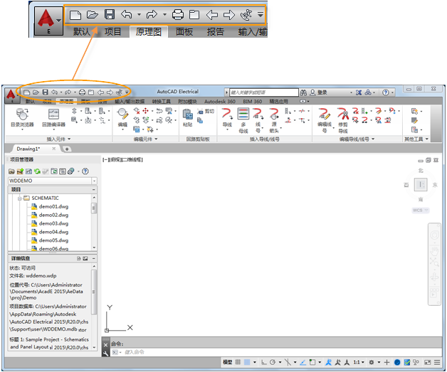从功能区中,您可以访问本手册中显示的所有功能。此外,显示的快速访问工具栏还包含 AutoCAD Electrical 中使用的某些导航命令。