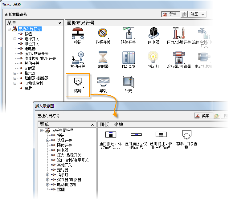 使用面板图标菜单插入铭牌。