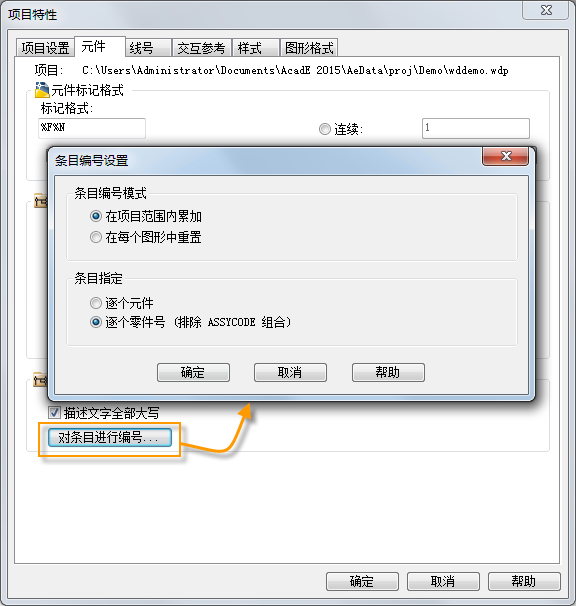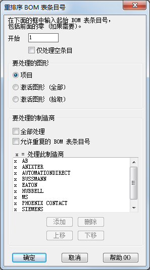 有几个项目特性会影响 BOM 表条目编号。请确保根据您的首选项设定这些特性,然后再重排序 BOM 表条目号。