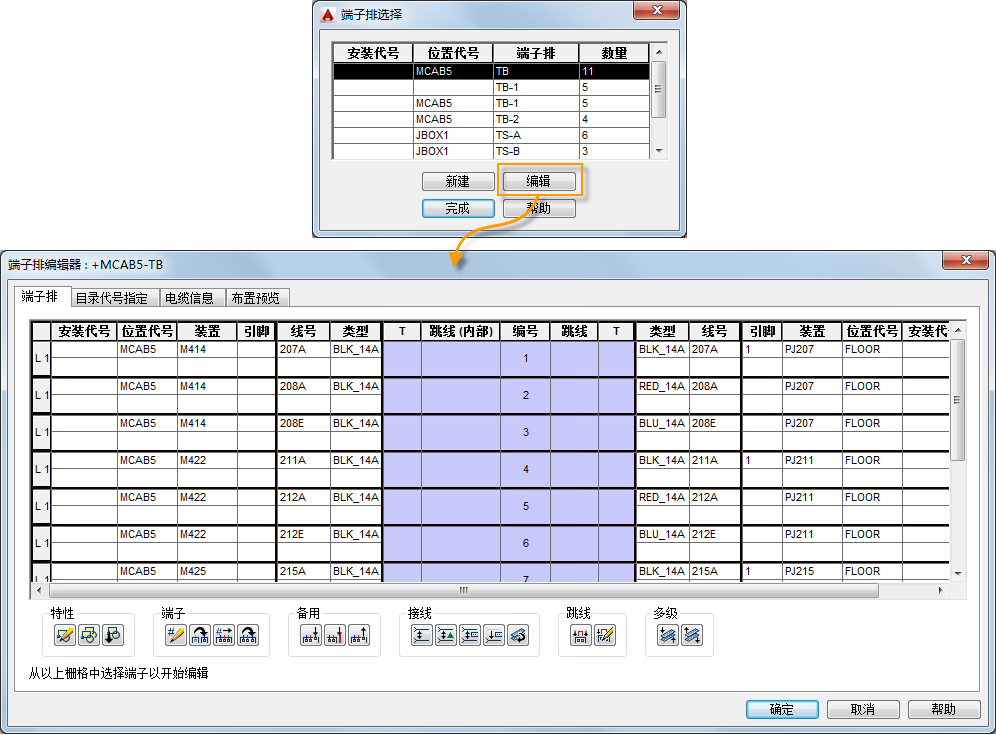 该编辑器包含有关目录值、连接的元件、连接的导线、线号等内容的信息。