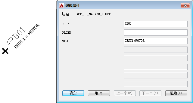 - 在 AutoCAD Electrical 中,查找定义电动机符号插入点的标记块。查找 CODE 属性值,例如 MTR03。