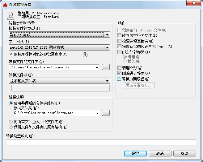 输入转换设置的说明。此说明将显示在转换文件设置列表下的“DWG 转换”对话框和“转换设置”对话框中。用户可以选择列表中的任何转换设置以显示其说明。