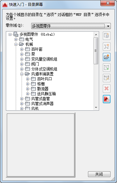 启动构件编辑器时,将显示“快速入门 - 目录屏幕”对话框。该任务特定的对话框可充当一个开关,能使您快速访问不同的工作环境。“快速入门 - 目录屏幕”对话框包含一个零件目录浏览器和一个图标栏。从“选项”对话框中的“MEP 目录”选项卡上指定的已加载零件目录列表中选择一个目录。若要了解有关零件目录以及如何在目录中存储零件的详细信息,请参见“零件目录的基本内容”。