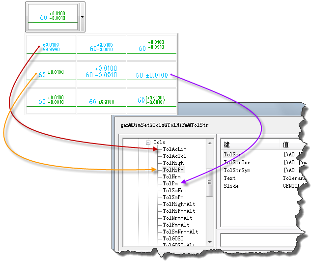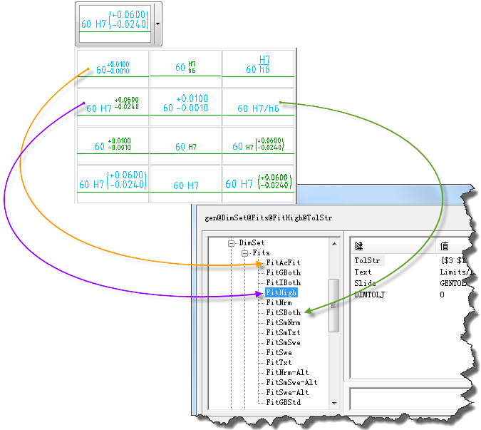 无论是配合条目还是公差条目,对应“Fits”和“Tols”下条目的键是一样的。