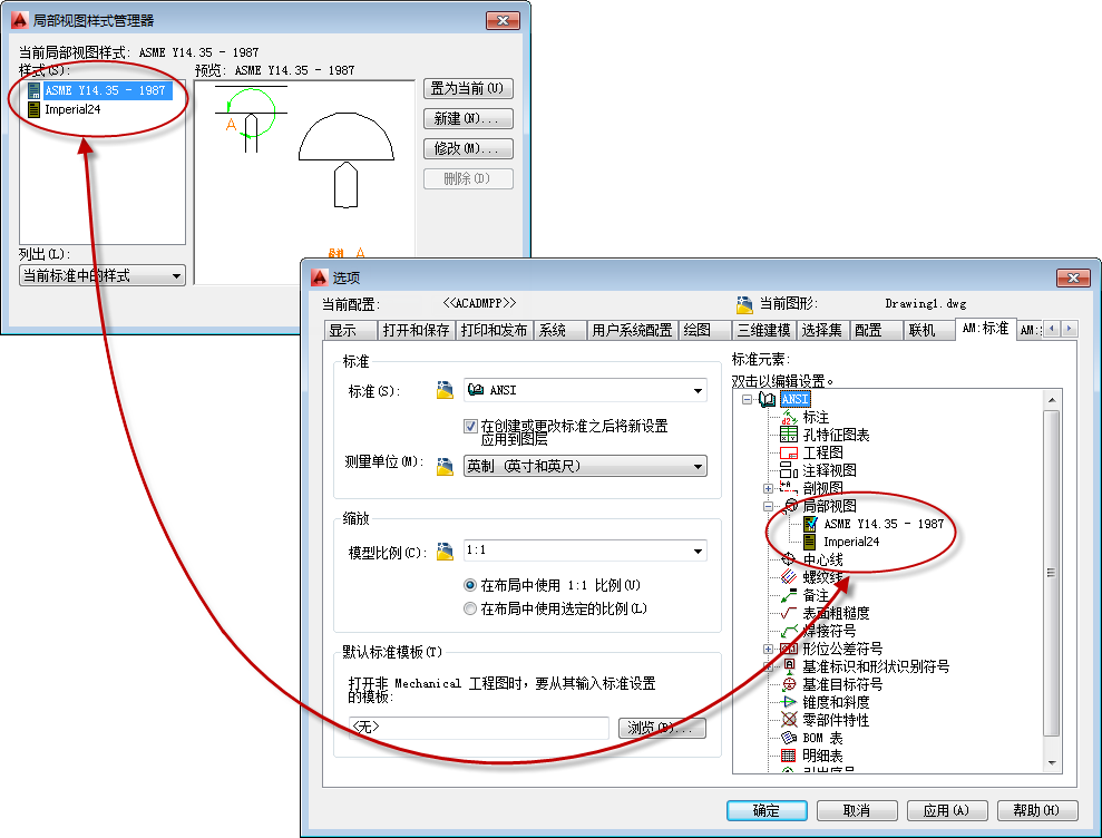 用于控制 AutoCAD Mechanical 对象外观的设置将被保存到一个被称为绘图标准的命名设置集合。同样,局部视图样式应用于 AutoCAD 对象(模型文档局部视图)的方式不同于它们应用于 AutoCAD Mechanical 对象(AMDETAIL 局部视图)的方式。相应地;