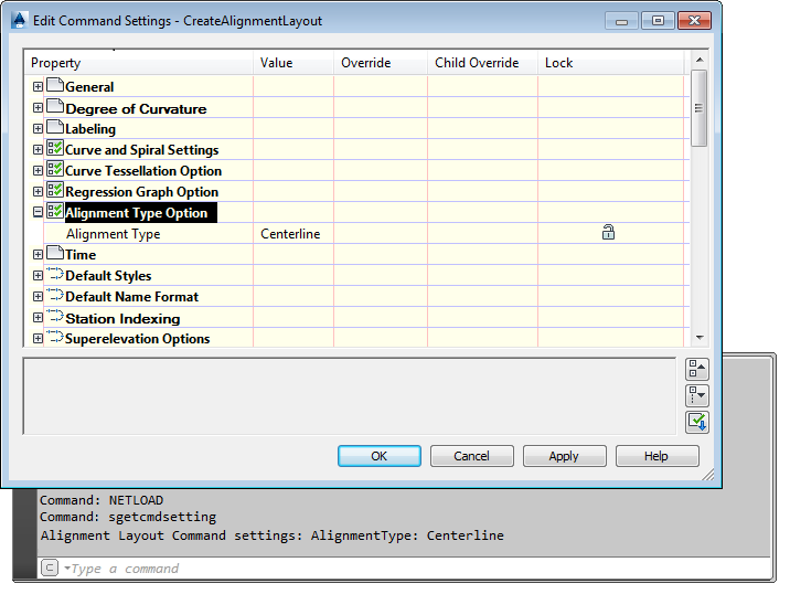 The command settings apply to commands, and correspond to the settings in the Commands folder for each item in the AutoCAD Civil 3DToolspace Settings Tab. Each command setting has a corresponding class named SettingsCmdCommandName. For example, the settings class corresponding to the CreateAlignmentLayout command is SettingsCmdCreateAlignmentLayout. As with other types of settings, you use the CivilDocument.Settings.GetSettings() method to access command settings objects in the document.