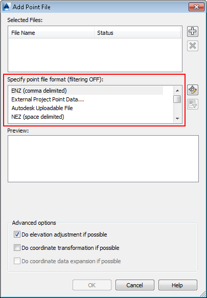 This is an example of adding a PENZD format point file to an existing surface. The file in this example is from the Civil 3D tutorials directory.