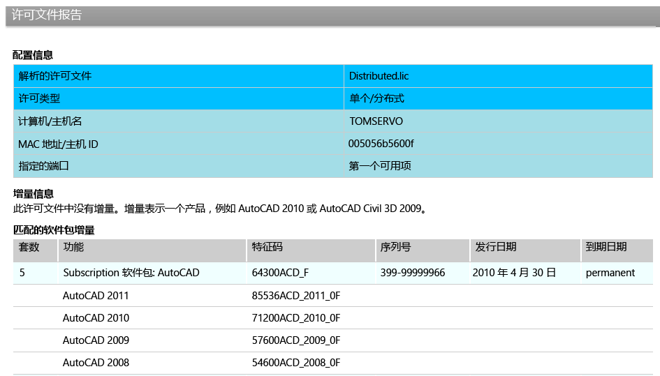 从 Autodesk 收到的网络许可文件包含许可信息,可向您提供授权以在网络安装中使用一个或多个 Autodesk 产品。文件包含网络服务关于网络服务器节点和供应商后台程序以及加密数字签名的信息。如果任何技术信息(如主机名和 ID)不正确,则产生的许可错误将使您无法使用 Autodesk 产品。如果文件中的主机名与实际的主机名不匹配,您可以使用文本编辑器手动编辑许可文件。但是,如果文件中的主机 ID 不正确,则您必须从 Autodesk 请求新的许可文件。