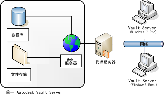 Autodesk Vault Server 实际上是一个 Web 应用程序,它使用服务来管理客户端和服务器之间通过 Web 服务进行的通讯。客户端和服务器之间的交互类似于 Web 浏览器与 Internet 上某个站点的通讯方式。Web 服务使用标准的 HTTP 方法,默认情况下通过 Web 服务器端口 80 进行通讯。 多用户配置需要 Microsoft IIS。
