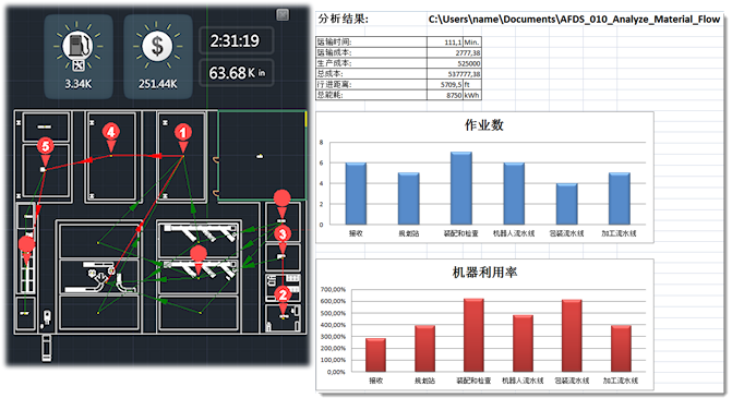 您可以分析 Factory 布局的运输成本和机器利用率。然后,修改布局并重新分析以优化 Factory 布局。