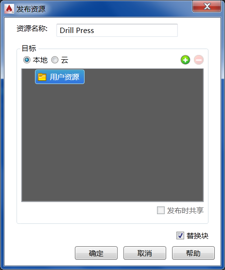 - 为资源指定默认的“用户资源”文件夹或者创建一个新的子文件夹后,可以通过选择“本地”或“云”选项按钮指示是将资源发布到本地还是发布到云。使用“添加”