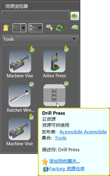 发布后,该资源将可用于在“资源浏览器”中下载。通过适用于基于云的资源的浏览器也可访问“Factory 资源仓库”。