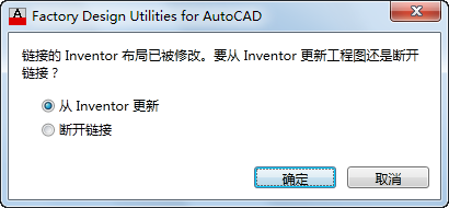 如果与某个 AutoCAD 二维工程图链接的 Inventor Factory 布局经过了修改,则打开该二维工程图时会显示以下对话框。单击“确定”可使用三维布局中的更改更新该工程图。