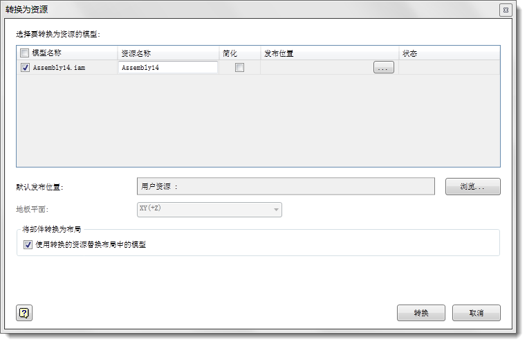 - 选择“使用转换的资源替换布局中的模型”可将当前布局中的模型自动替换为新创建的资源。如果不选择此选项,则仍会创建资源并将其添加到您的用户资源库,但模型保持在布局中。