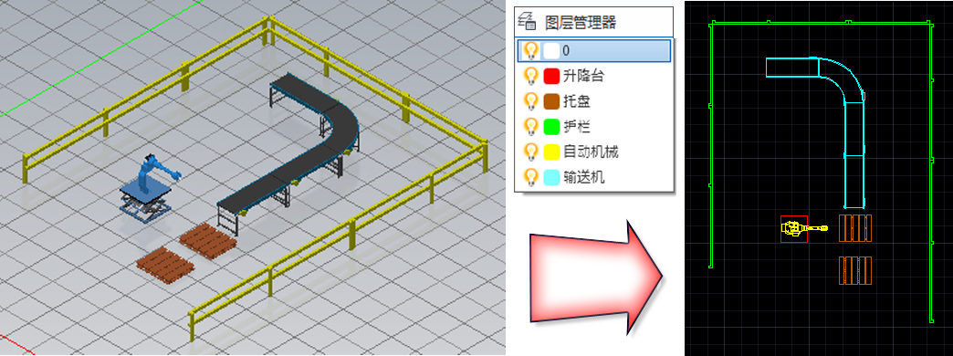通过“图层管理器”,可以在 Inventor Factory 布局中创建、重命名三维资源的图层,打开/关闭可见性,以及删除三维资源的图层。您可以将指定颜色指定或重新指定给每个图层,然后选择将该颜色应用到图层中的资源以方便识别。图层及其指定的颜色也可以从现有 DWG 导入。