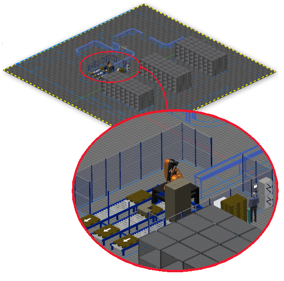 Factory 地板布局是工厂、仓库或办公室环境的三维模型。尺寸和复杂性可以小到一个工作单元,大到整个工厂。布局可以包含建筑元素,如墙壁、柱和公共设施。您可以检查有无干涉发生,规划设备的各部分如何连接到电源、数据资源、压缩空气资源或其他资源。