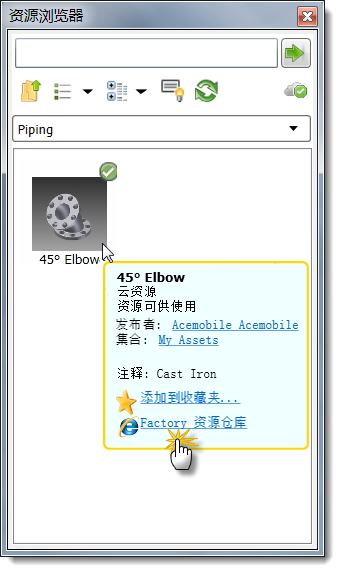 按钮,。添加集合时会创建一个新文件夹,可以根据需要在创建时为该文件夹命名或稍后进行重命名。 资源发布到云后,即会显示在“资源浏览器”中供下载。通过适用于基于云的资源的浏览器也可访问“Factory 资源仓库”。