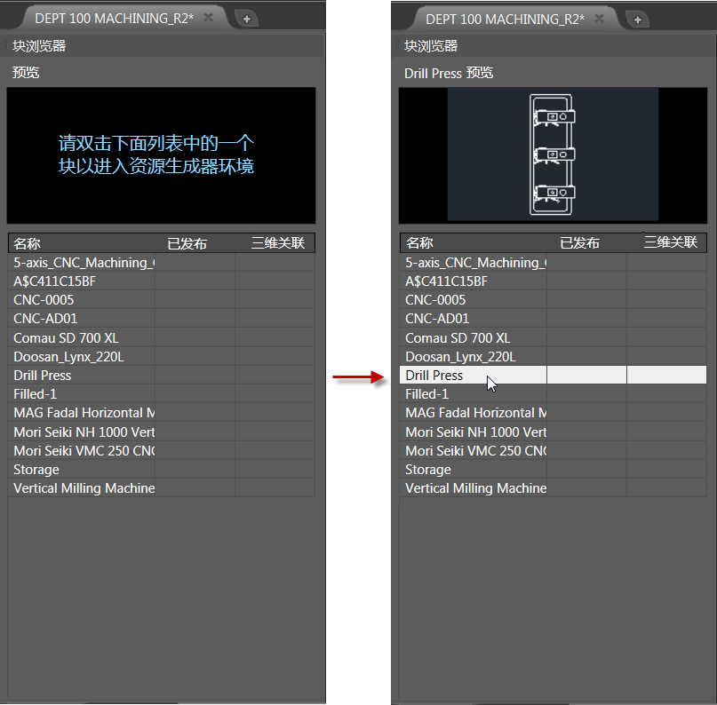 双击要转换为资源并发布的块。这样会进入“资源生成器”环境,并且所选的块将显示在“块浏览器”预览窗口中,如上图所示。该块也会在图形窗口中亮显。您也可以通过在图层中的块上单击鼠标右键,然后在关联菜单中选择“Factory”>“资源生成器”来访问资源生成器。